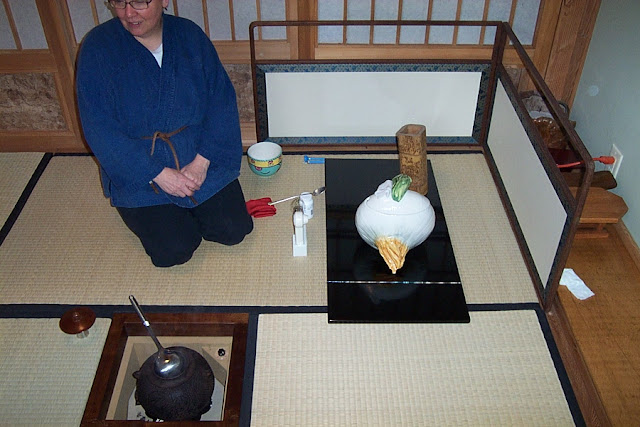 We just had an intensive workshop here in Portland with Christy-sensei. It is always inspiring and somewhat intimidating. The format is one after another, students make tea for sensei and we often go from the very beginning procedures to the very highest in the space of about 3 days. Or maybe in the reverse order, depending on the schedule. We all were studying our notes before she arrived, and sitting seiza at night watching TV to build up our strength for those 12 hour days sitting seiza.